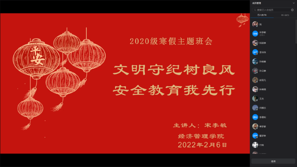 此次安全教育主题班会,各年级辅导员以班级为单位,通过钉钉会议线上开展。老师们结合当前疫情防控形势,向员工们进行寒假安全教育,叮嘱员工们树立严防严控意识,遵守当地疫情防控要求,做好安全防护。