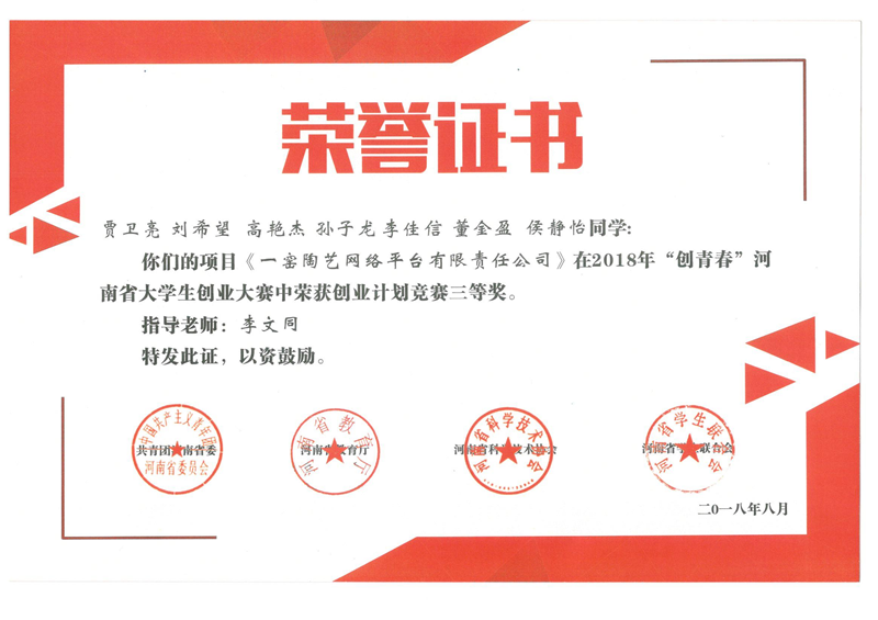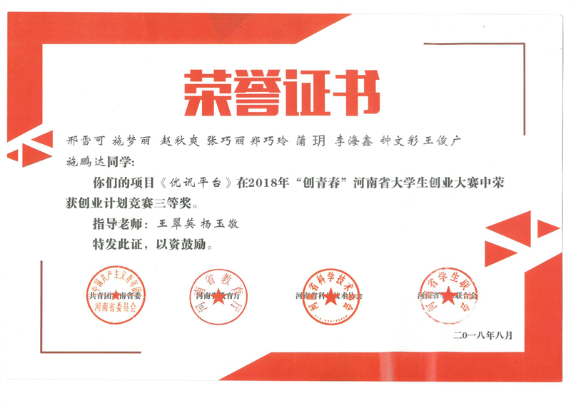 公司参赛选手在比赛中以新颖的角度、独特的创业观点充分展现自己的作品,并在公开答辩中获评委老师的一致认可。最终,以2016级市场营销专业贾卫亮为队长、由李文同老师指导的《一窑陶艺网络平台有限责任公司》项目,以2015级国际经济与贸易专业邢雪可为队长、由王翠英、杨玉敬老师指导的《优讯平台》项目,以2016级会计学(中外合作)专业仇家荣为队长、彭翠珍老师指导的《医疗信息服务项目》等三个创业项目在2018年“创青春”河南省老员工创业大赛上获得三等奖。