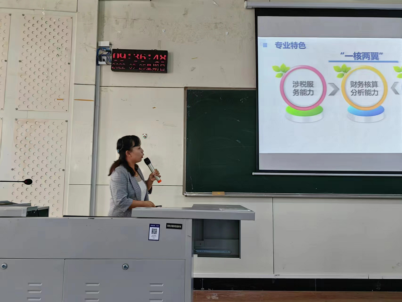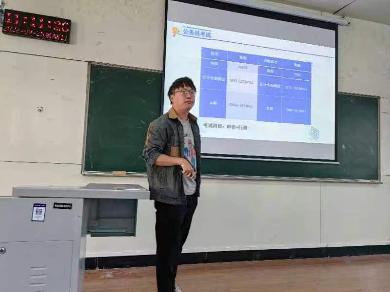 朝气蓬勃的青年教师赵壮通过近几年公务员和教师招聘人数和专业需求等几个方面做了数据分析,让同学们直观了解了会计专业员工不仅仅可以做单位会计,还可以考取公务员和教师,同学们为选择会计专业而感到自豪。