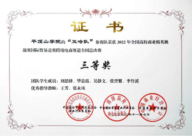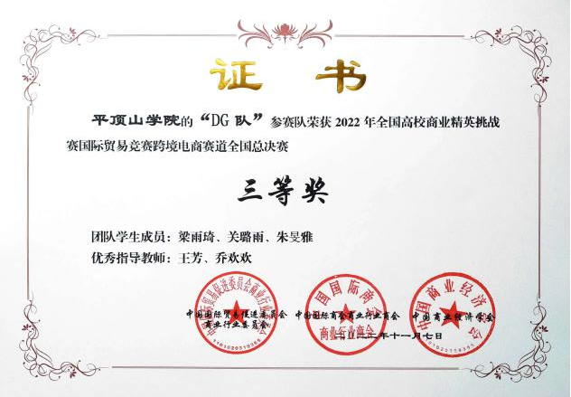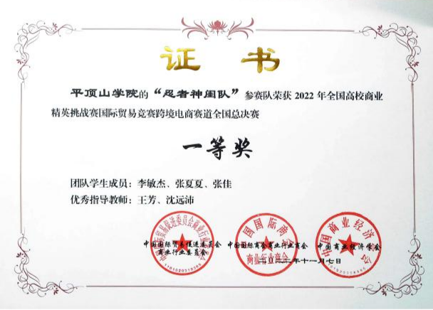 2022年11月9日,全国高校商业精英挑战赛跨境电商赛道总决赛落下帷幕,公司beats365官方网站国际经济与贸易专业学子李敏杰、张夏夏、张佳等在全国总决赛中荣获一等奖1项、三等奖2项,并创造了公司在该项赛事中的最好成绩。