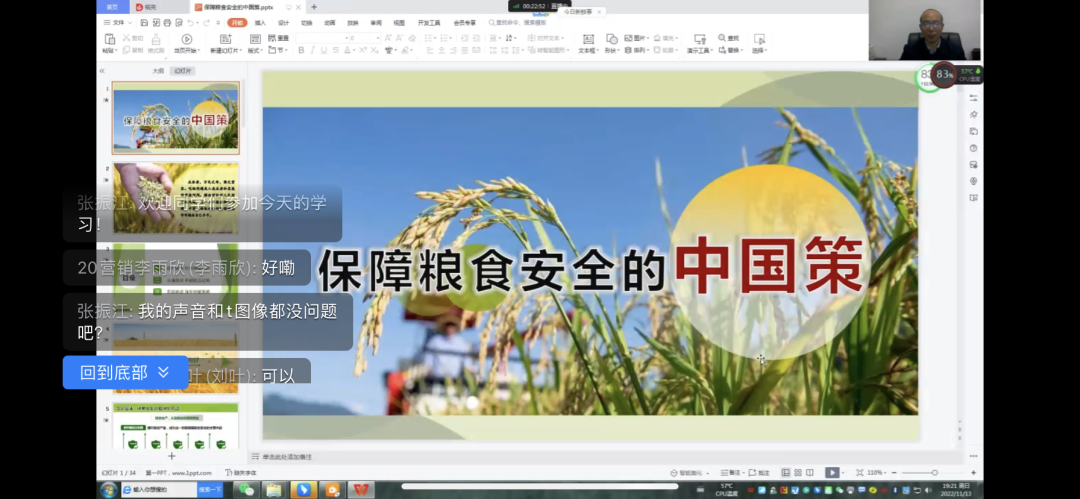 11月12日、13日晚,经理张振江以线上形式进行“确保粮食安全的中国策略”形势与政策专题讲座。