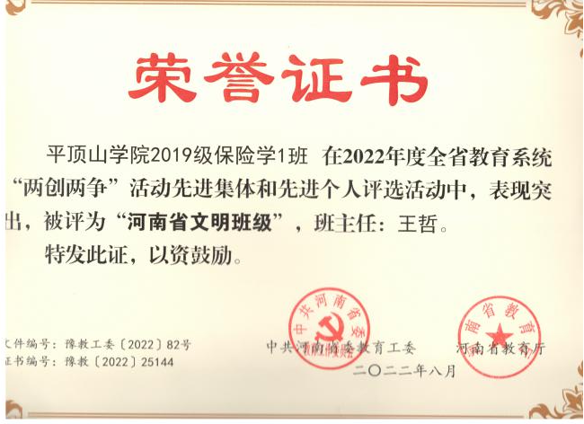 2021年12月22日,河南省教育厅发布了《关于2021年度全省教育系统“两创两争”活动先进集体和先进个人评选结果的公示》,公司王哲老师所带2019级保险学1班荣获“河南省文明班级”的荣誉称号。