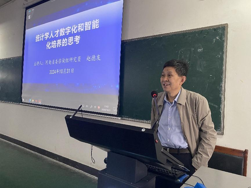 报告会特邀河南省统计局原副局长、一级巡视员,河南省统计学会副会长、河南省委咨询组研究员赵德友作报告,他就数字化、智能化时代如何提高统计学教学研究水平,如何培养统计学高素质人才进行了深入的讲解和分析,强调要围绕“数字化和智能化”,勤学精炼,提高师生应用大数据和人工智能的能力。本次报告紧扣前沿领域、聚焦大数据及人工智能背景下的统计学发展方向,内容丰富,精彩生动,使参会人员受益匪浅。