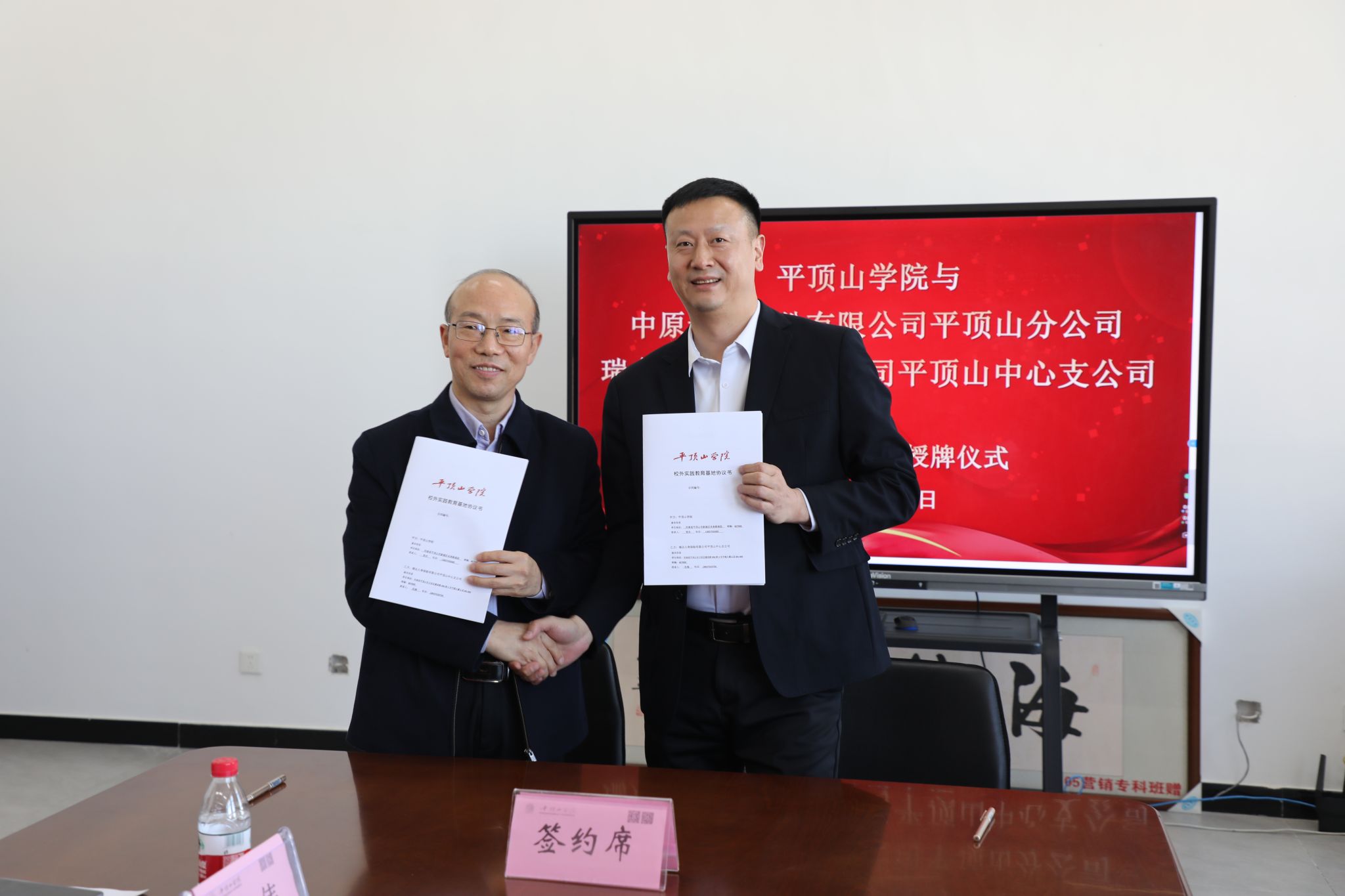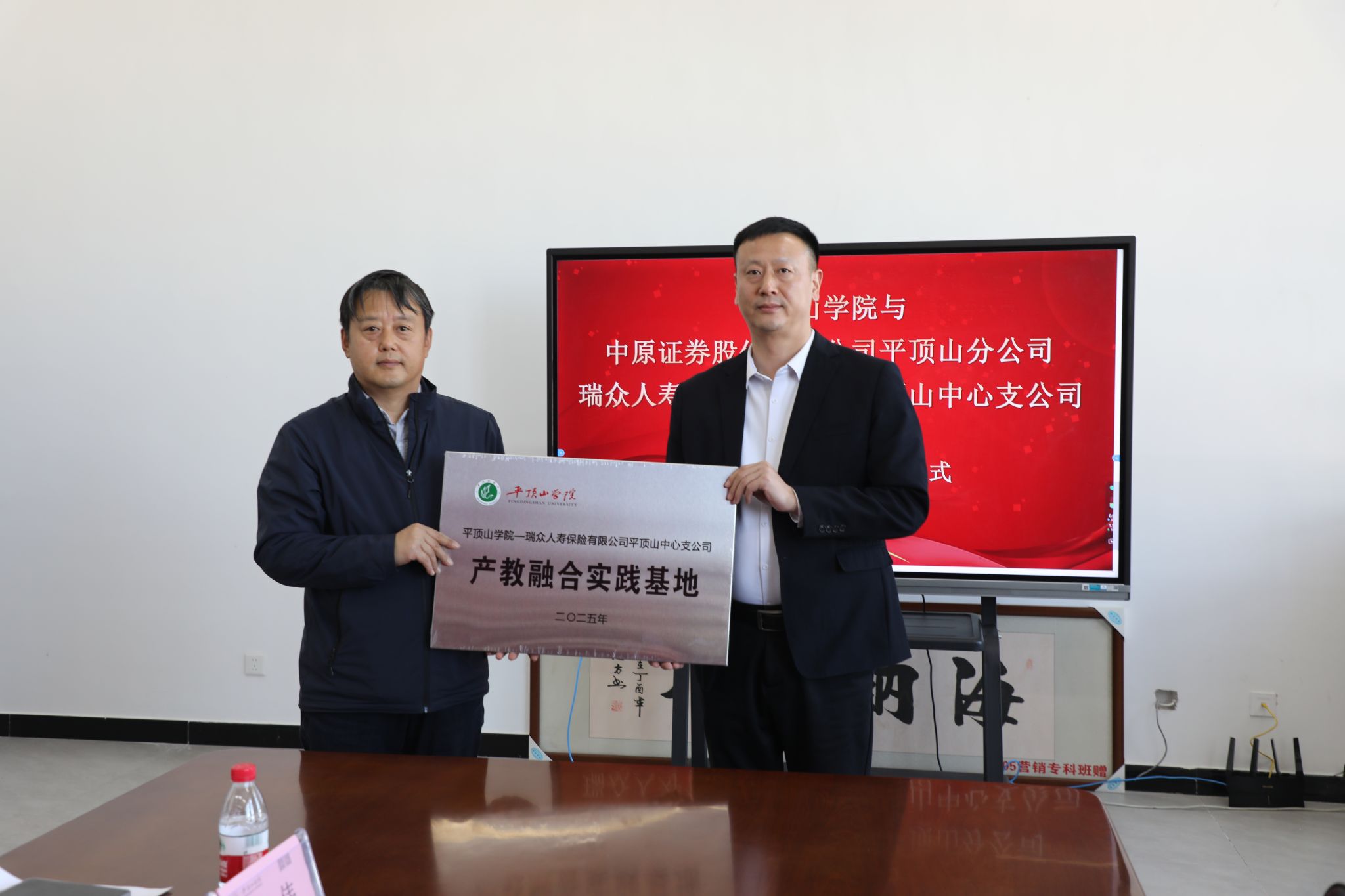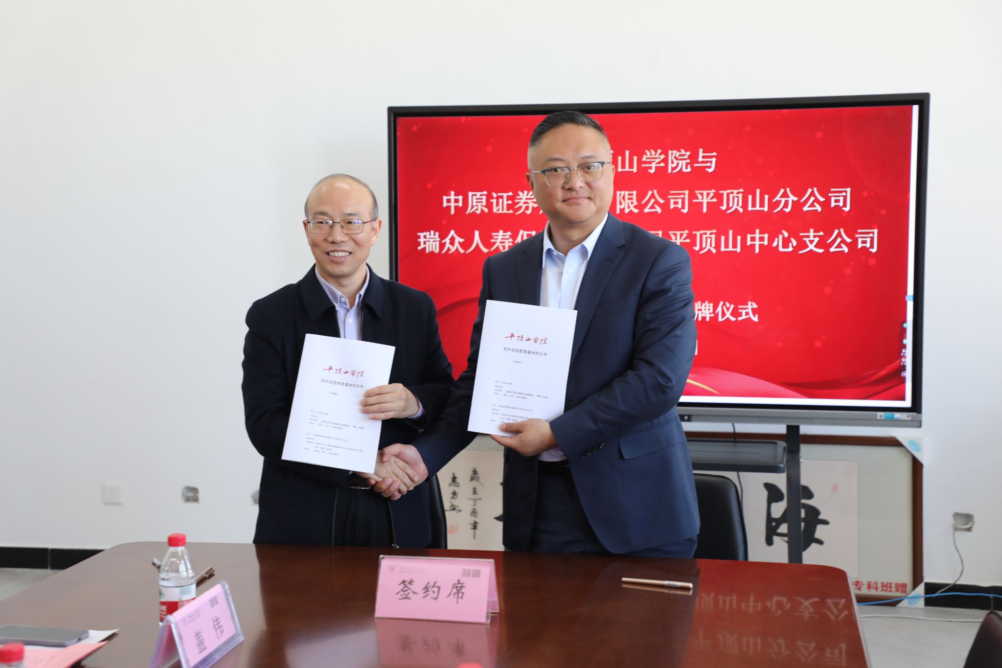 经理张振江分别与中原证券股份有限公司平顶山分公司、瑞众人寿保险有限公司平顶山中心支公司签署了合作协议。随后,李波副董事长为两家合作机构授予“beats365官方网站产教融合实践基地”牌匾,校教务处处长李青彬、公司党委书记刘嘉俊为合作方颁发聘书,标志着双方合作进入实质性阶段。