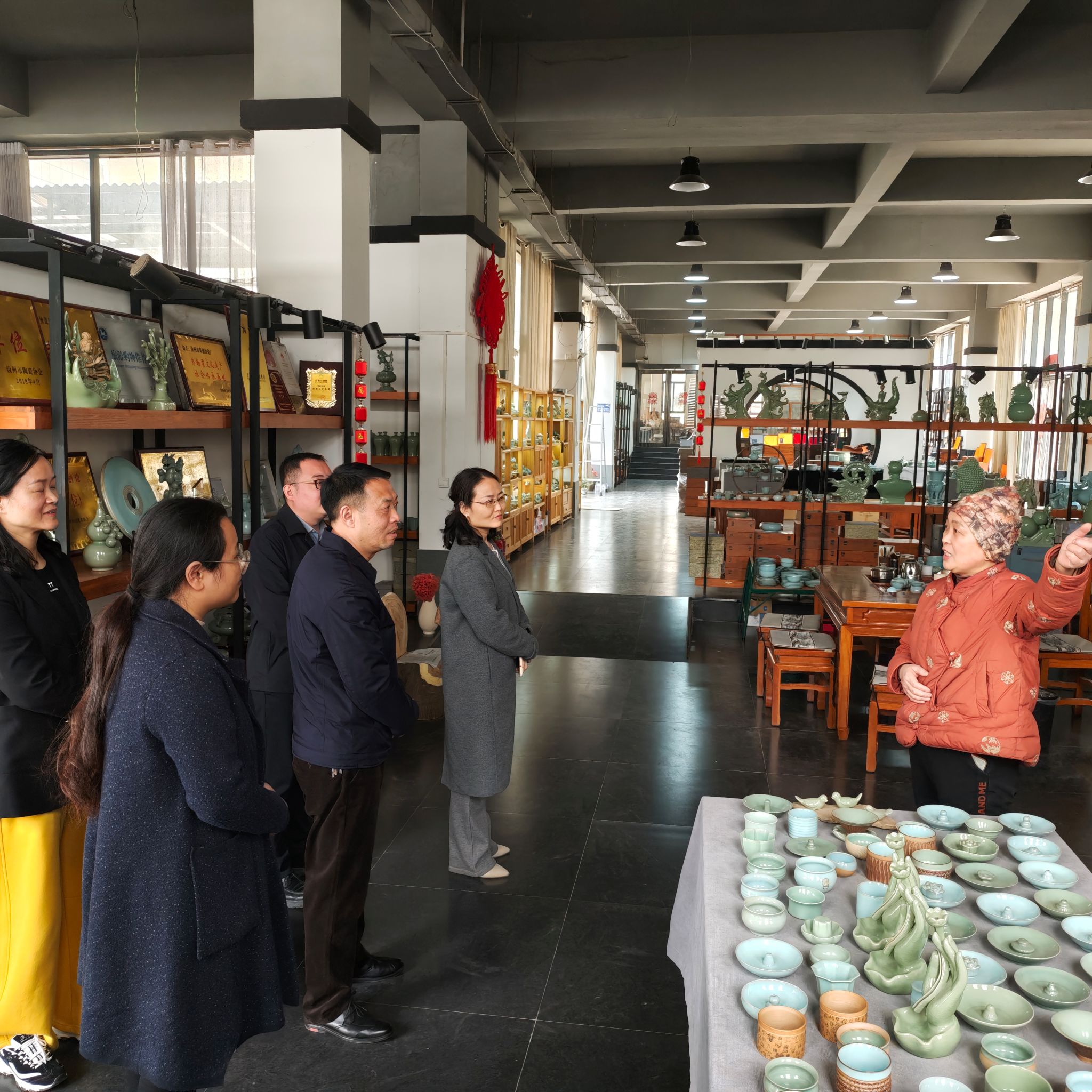 调研团队又前往汝瓷小镇,参观了中国汝瓷智谷汝瓷供应链中心和汝瓷产品检测中心,听取了汝瓷管委会工作人员及小镇委托运营公司项目负责人对汝瓷供应链中心运营筹备情况介绍,并实地调研了荣盛汝瓷等几家汝瓷企业。