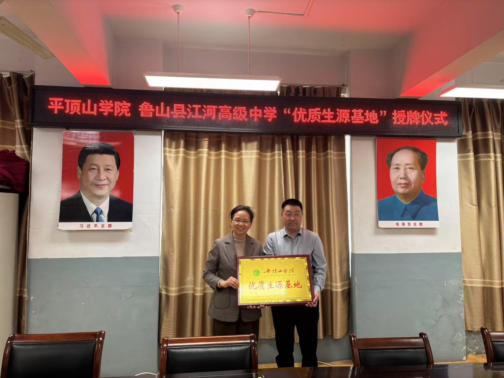 4月3日下午,公司党委书记刘嘉俊、党委副书记李刚一行前往鲁山县江河高中开展招生宣传与优质生源基地授牌活动。