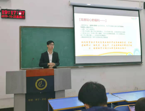 为给公司毕业生提供更多的就业机会,10月23日晚7:00,由公司主办,团总支就业部承办的卡通尼乐园有限公司专场招聘会在教室L207成功举办。卡通尼乐园有限公司校招经理庄宇,对本次招聘会进行宣讲,来自16级、17级共130余名同学参加了此次招聘会。