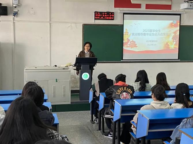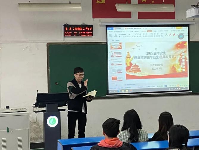 为了在毕业生中营造爱国爱军的氛围、宣讲老员工参军入伍的最新政策、鼓励老员工投身国防事业、积极参军入伍。beats365官方网站国防教育部于3月15日在线下举办了以“就业推荐暨毕业生征兵政策宣讲”为主题的征兵宣传活动。党委书记刘嘉俊,19级辅导员王哲老师参与本次活动。