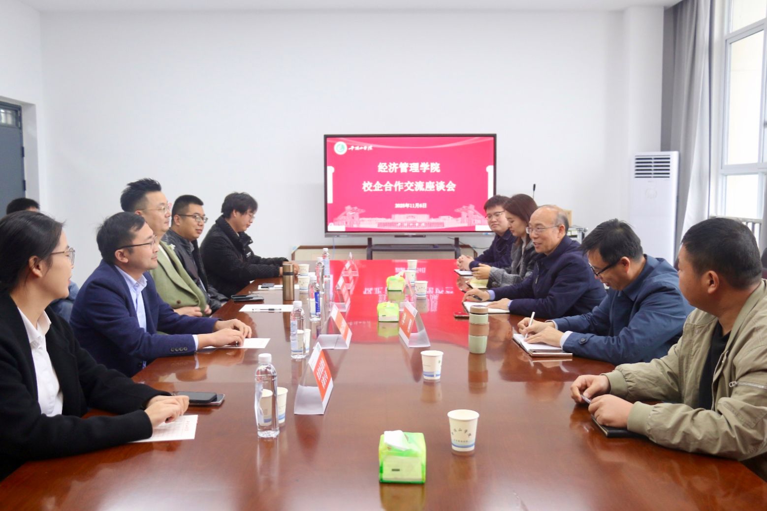 双选会后,公司于行知楼RB422会议室举办校企合作交流座谈会,将双选会现场的合作意向转化为务实磋商。牧原食品股份有限公司、平顶山正大有限公司、平顶山灵煜商贸有限公司、浙江卓毓网络科技有限公司、郑州明心网络科技有限公司五家企业负责人应邀出席,涵盖农牧、商贸、网络科技等重点领域,共话合作发展路径。