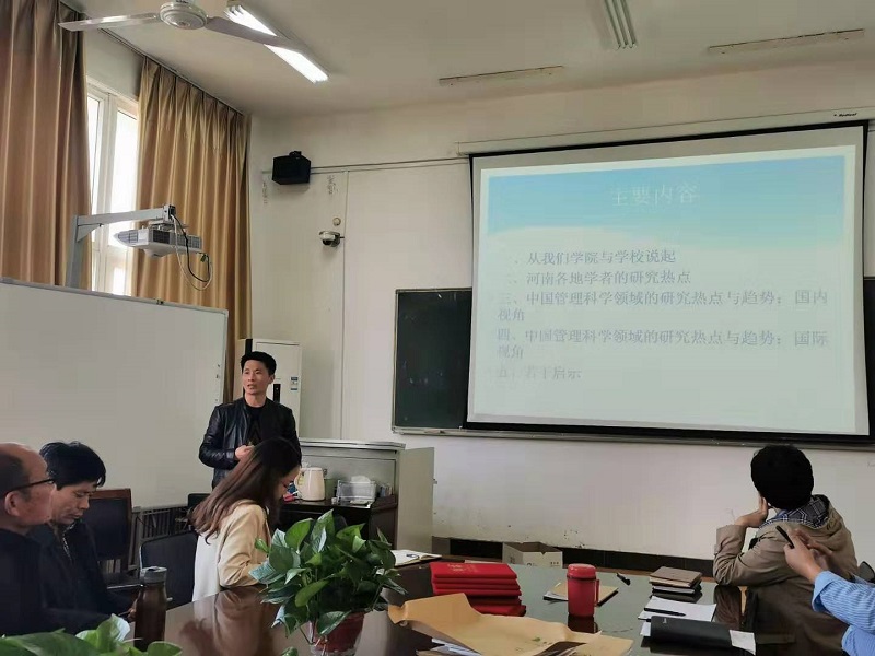 报告会上,罗博士首先从合作机构、作者和关键词聚类这三个方面的数据分析结果,总结出经管院与公司的科研现状与特征;接着对河南省内各高校的研究热点进行了分析总结;随后,分别通过国内外不同视角对中国管理科学领域的研究热点与趋势进行了阐述,并总结出了若干启示。
