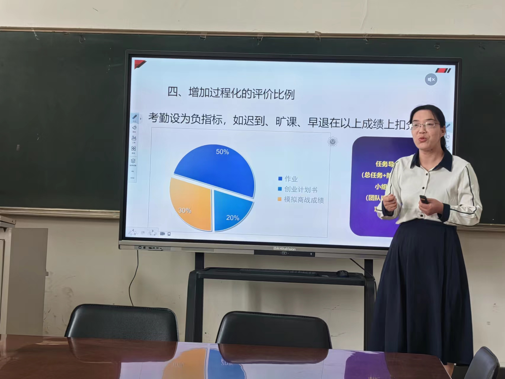 活动中,郭晓娜老师以“课程思政”为出发点,强调了评价体系在培养员工德性、团队协作精神和职业能力方面的重要作用。她提出的多元化评价主体和过程化评价比例的概念,为在场教师提供了新的教学评价思路。