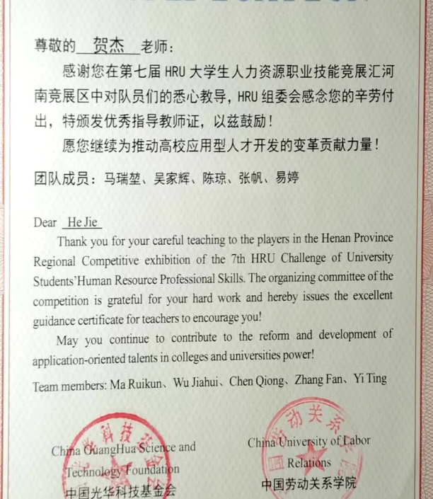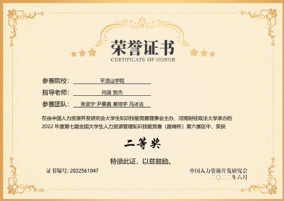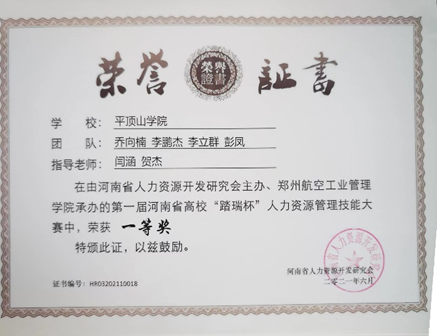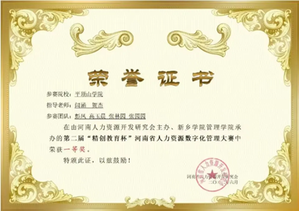 2021年10月我社前社长张亚宁同学带领团队代表公司参加第六届全国老员工人力资源管理知识技能竞赛(精创教育杯)全国总决赛,并荣获二等奖。2022年6月,在路辉同学和彭凤同学的带领下,我社成员所在的一队和二队均在第二届“精创教育杯”河南省人力资源数字化管理大赛中荣获一等奖。由张亚宁同学带领的第三小队在河南省人力资源管理知识竞赛(踏瑞杯)中获得二等奖。