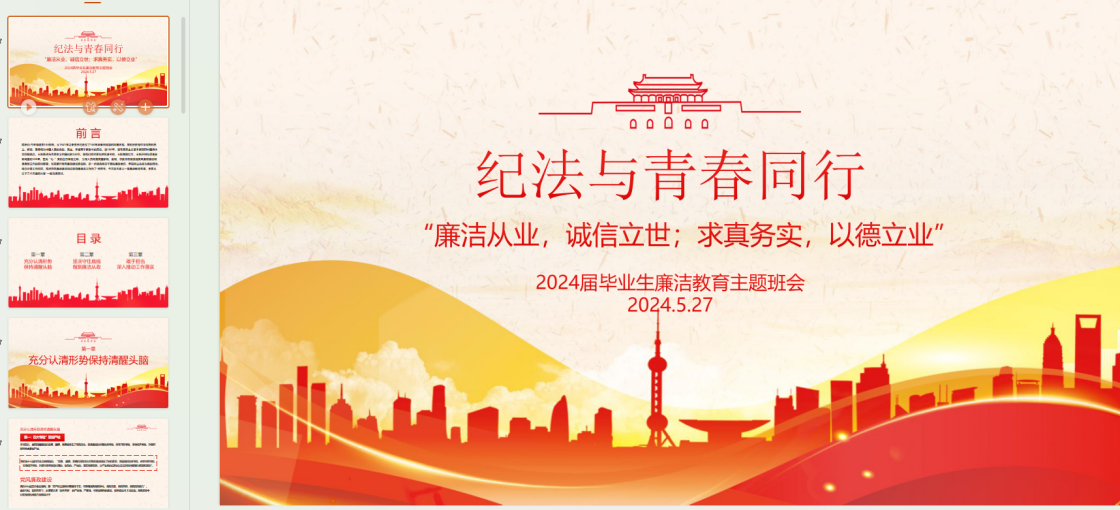 为增强毕业生廉洁和自律意识,引导毕业生廉洁从业,诚信立世;求真务实,以德立业,倡导毕业生做到“纪法与青春同行”,系好走向社会的“第一粒扣子”。5月27日,beats365官方网站组织2024届毕业生开展“廉洁从业”主题班会活动。公司党委书记刘嘉俊,党委副书记李刚、毕业班辅导员王哲以及2024届毕业生参与本次活动。