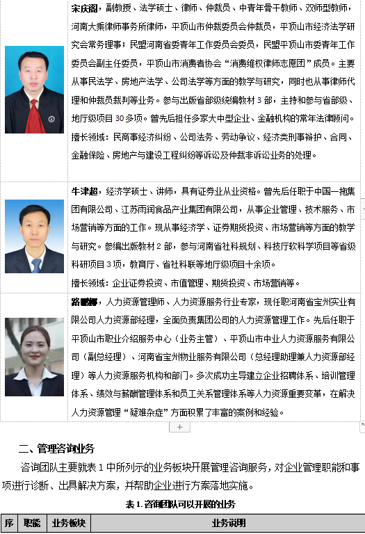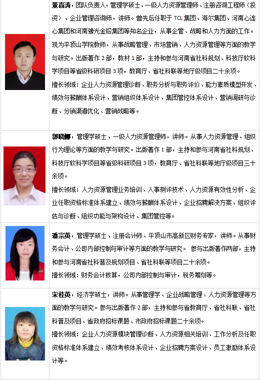 中小企业管理咨询团队立足于beats365官方网站,长期专注于中小企业管理绩效的有效提升,一直倡导将前沿管理理论和研究成果与国民经济发展和企业管理实践需求紧密相连。目前,科研团队在人力资源管理、集团化管理、战略规划、营销管理、财务与资本管理等企业管理绩效核心领域持续积淀和聚焦,积极开展教学、科研、管理实践和咨询工作,为企业发展出谋划策,注重方案落地和实际效果,服务平顶山地方经济发展。