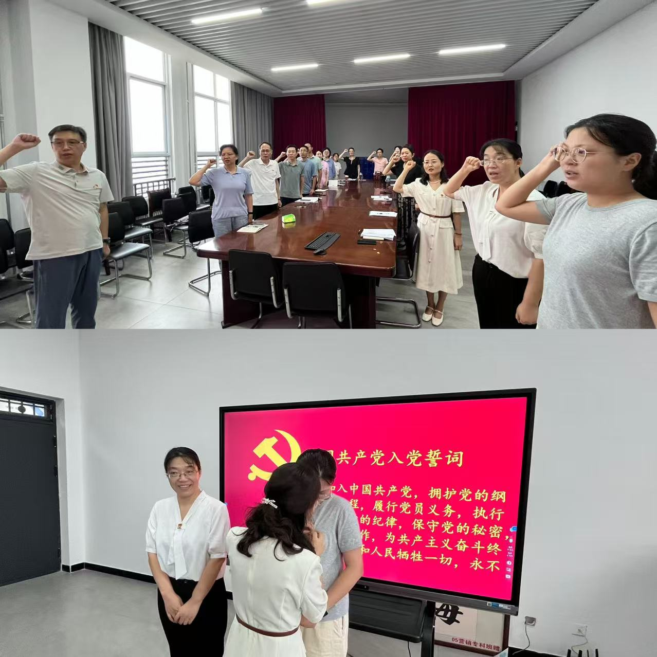 预备党员接收会议结束后,教工第二党支部杨玉敬书记为两位新党员佩戴党员徽章,全体党员在刘嘉俊书记、李刚书记和杨玉敬书记的带领下庄严宣誓。党员们神情庄重,声音洪亮,一句句庄严的誓言表达了他们对党的忠诚和为党的事业奋斗终身的决心。